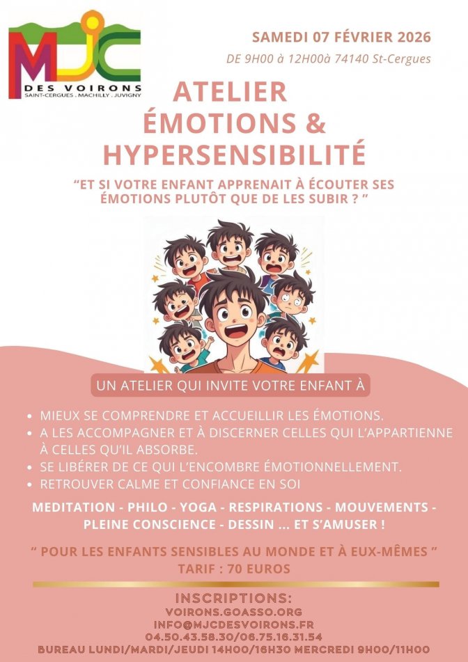 La MJC propose un atelier dédié aux enfants hypersensibles ce samedi 7 février 2026, de 9h à 12h. Animé par une experte, il aide les petits à mieux écouter leurs émotions, à se calmer et à retrouver confiance en eux grâce à des activités comme le yoga, la méditation et la pleine conscience.