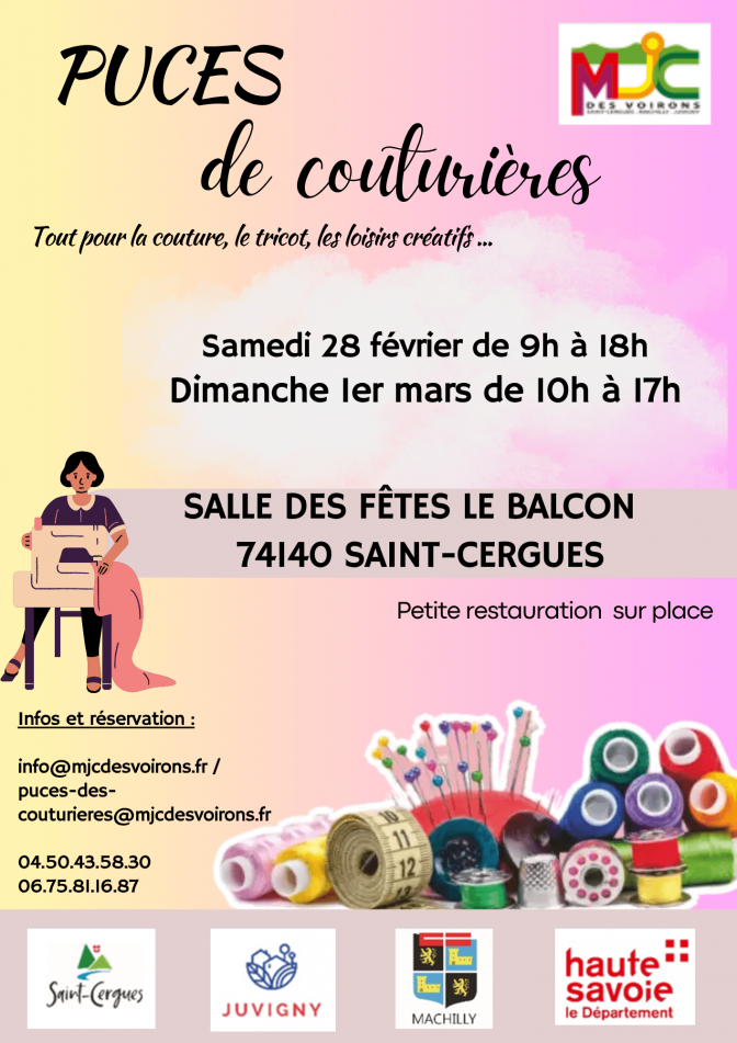 - Information et réservation : 04.50.43.58.30 / 06.75.81.16.87 / puces-des-couturieres@mjcdesvoirons.fr / info@mjcdesvoirons.fr
