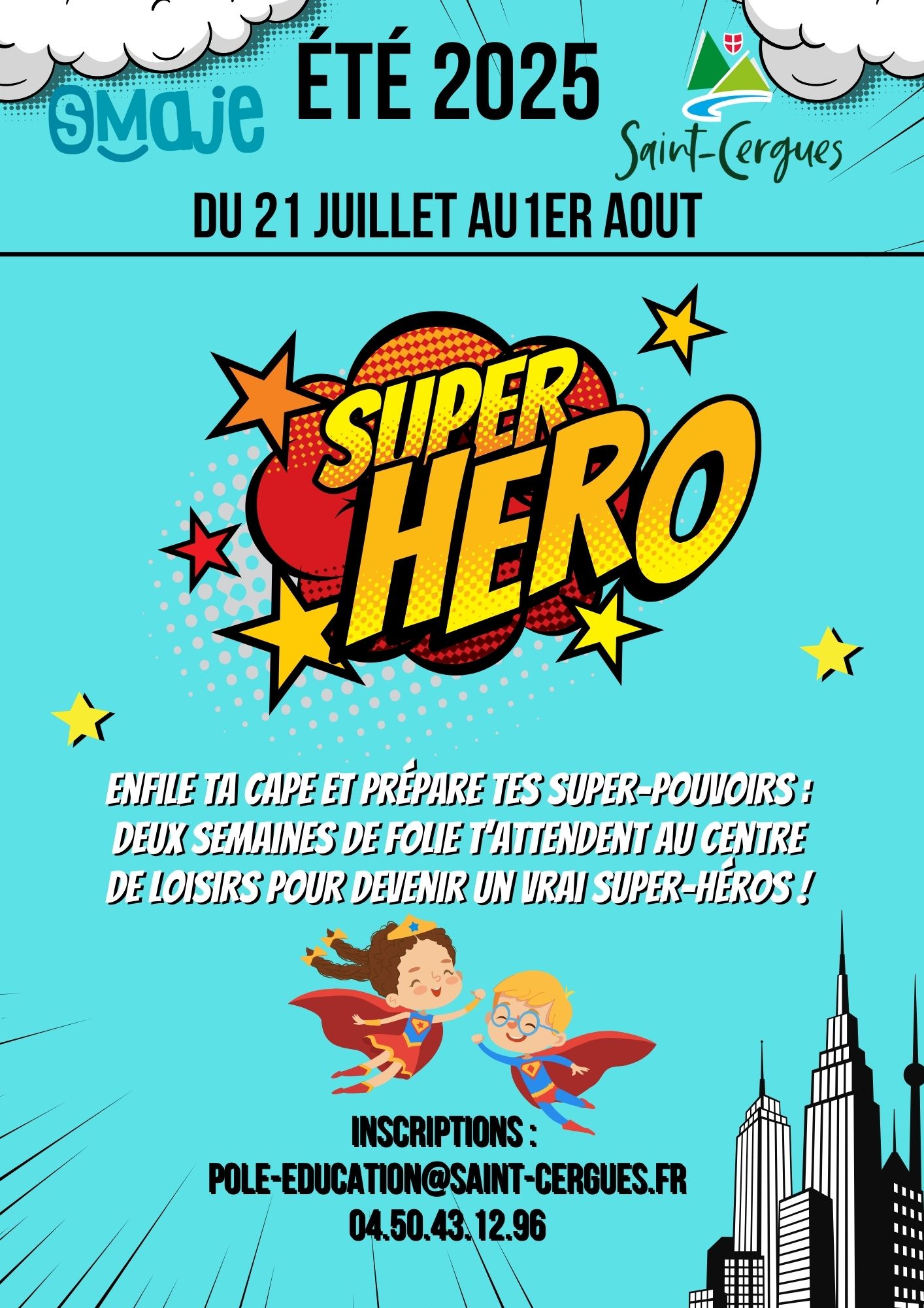 | Du 21 juillet au 1er août : Thème : Super héros Un programme dynamique et créatif pour révéler les pouvoirs de chacun à travers des jeux, défis et ateliers.  |