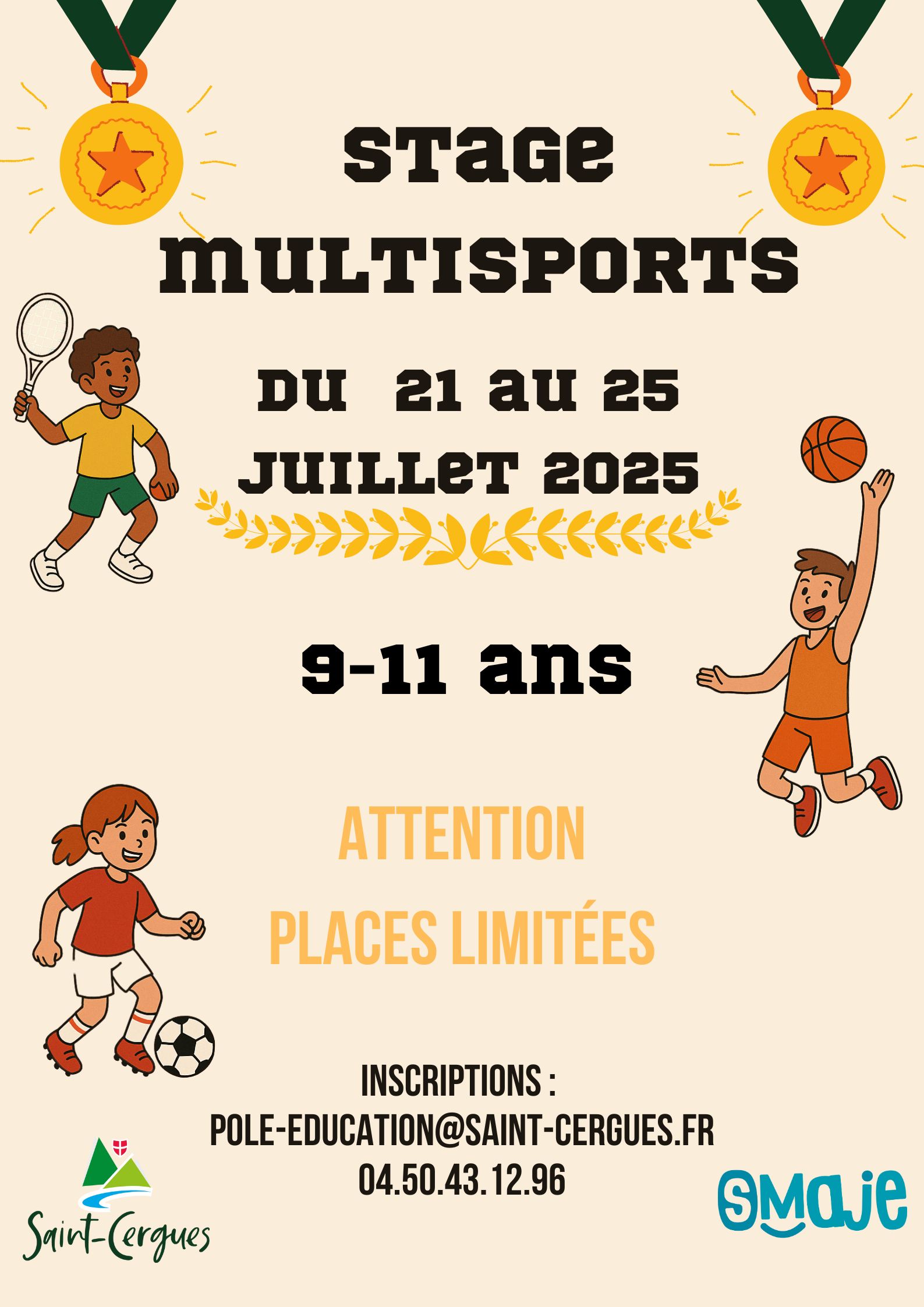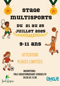 | Du 21 au 25 juillet : Stage multisports (9-11 ans) Une semaine pour découvrir et pratiquer différents sports en s’amusant avec les copains.  |