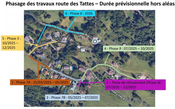 Après une pause hivernale jusqu’au 31 mars, les travaux d’eau potable, d’assainissement et de réseaux secs sur la route des Tattes se dérouleront progressivement selon le planning ci-dessous.